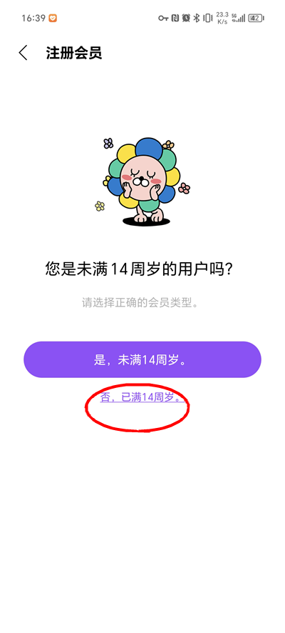 系统将提示选择是否年满14周岁——本教程以已满14周岁为例(未满14周岁需使用监护人信息注册);