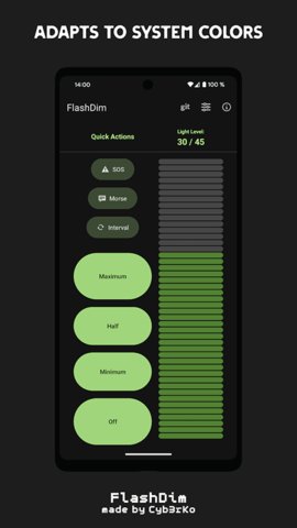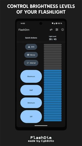 FlashDim是一款能够精细调节手机LED闪光灯亮度的实用工具。突破了传统手电筒仅有开关功能的局限,实现了从微弱光晕到全亮照明的平滑过渡。采用直观的滑动条设计,让使用者可以根据实际需要精准设定每个亮度级别,特别适合在不同光线环境下使用。