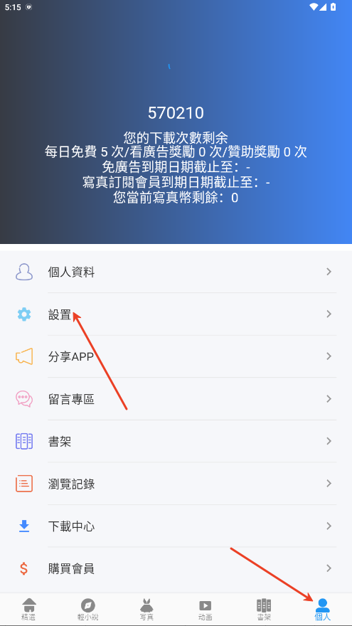 1、打开拷贝漫画APP,在【个人点】击设置按钮。