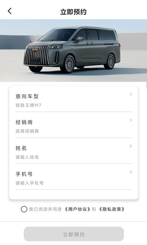 1、打开锐胜汽车APP后,首先在首页选择预约试驾模块,浏览可试驾的车型,点击感兴趣的车型,填写相关信息进行预约。