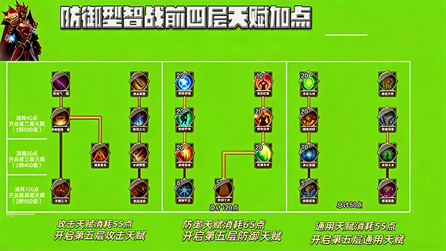 因为智战第五层天赋开启需要消耗175点天赋,比智弓少10点,而防御加满以及加满通用的左侧,刚好可以满足需求。