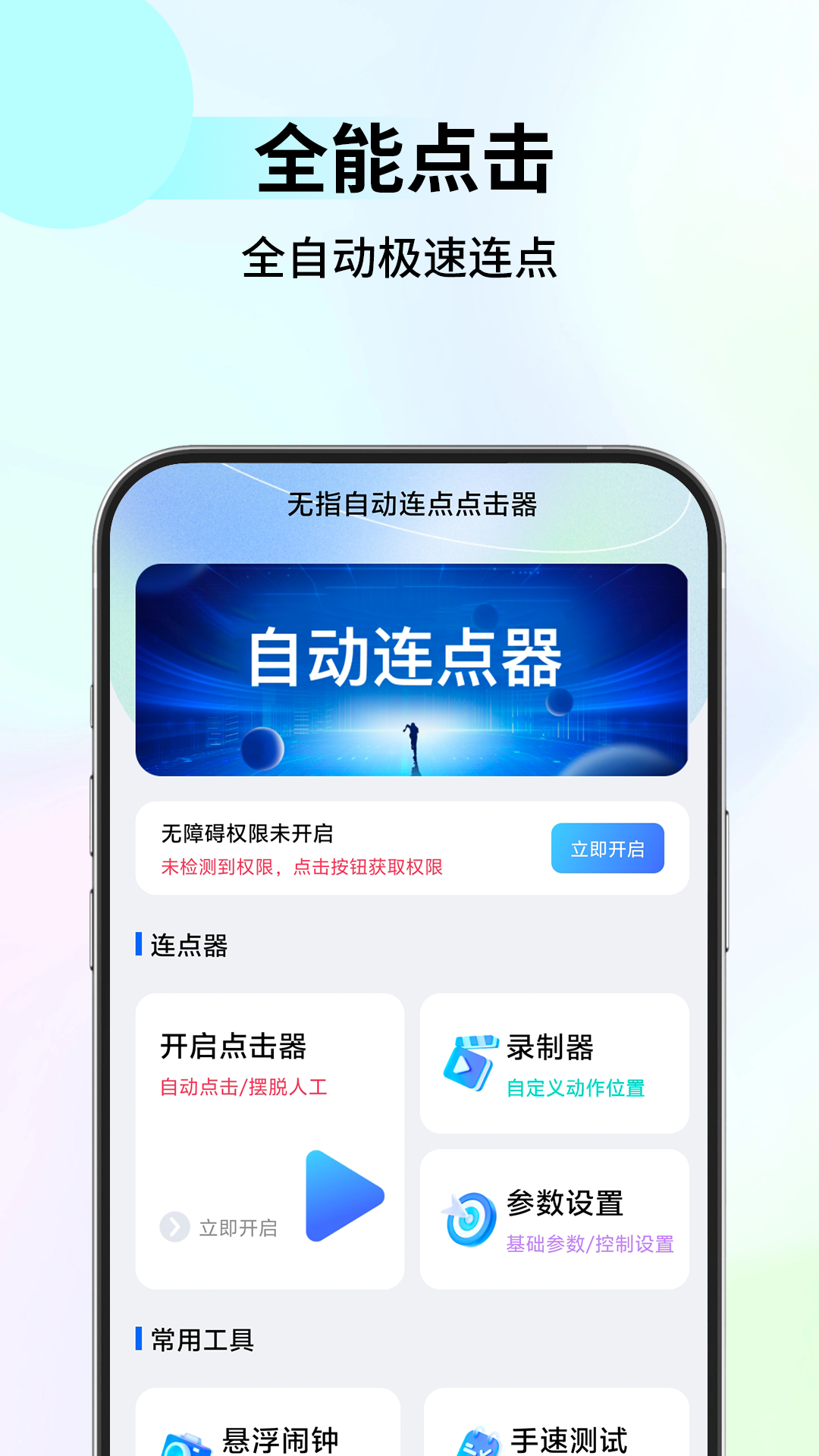 无指自动连点点击器是合肥灵动翊谷科技有限公司开发的一款运行于安卓设备的自动化操作工具,有效模拟屏幕点击与滑动动作来执行重复性任务,无需获取手机高级权限即可工作,带来了点击、连击、手势录制等多种基础动作单元,这些单元能够自由组合并设定执行条件与时间,从而应对游戏挂机、应用测试或日常操作批处理等多样化场景。