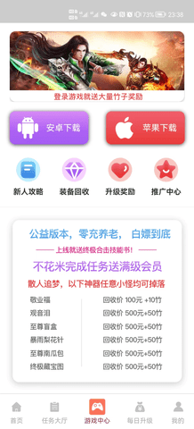 2、游戏试玩模块为平台合作游戏,下载登录指定游戏就能获得竹笋和竹子奖励,竹子平台保底2元起/个回收,竹笋可以获得平台每日分红;