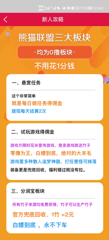 熊猫联盟app是一款手机赚钱软件,在这里可以做任务赚钱,可以试玩游戏赚钱,每天还有官方奖励,佣金满1元就可以提现,空闲时间做做任务,玩玩游戏,轻轻松松赚到零花钱,邀请朋友来熊猫联盟app还有惊喜大礼包哦。