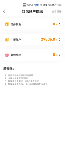 2、任务赏金和其他奖励满1元即可提现,每天可提现一次;