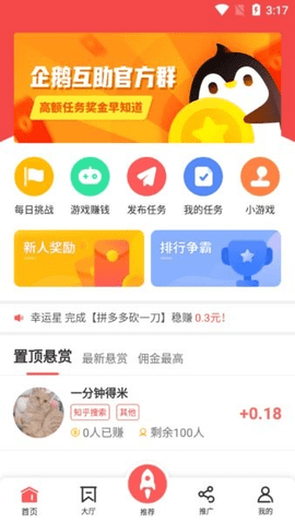 企鹅互助app是一款手机任务悬赏赚钱平台,平台提供了海量悬赏任务,接单做任务即可轻松赚钱,新用户注册还有1.7元新人现金红包,收益满2元就可以提现到微信支付宝,使用简单,操作方便,邀请好友一起赚钱还有长期收益分红哦。