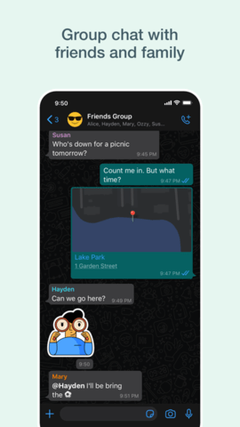 WhatsApp是一款在全球范围内拥有大量用户的即时通讯工具,通过网络连接让人们可以跨越不同国家和地区进行语音和视频通话,同时可以发送照片、视频以及各种多媒体文件,还能创建群聊让朋友、家人和同事在同一个空间里方便地交流和分享生活点滴,而且使用端到端加密技术保障信息在传输过程中的安全和私密,确保聊天内容不会被他人查看或篡改。