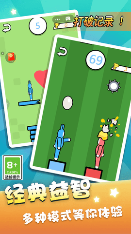 2、双人跳一跳兔子游戏还有双人闯关、叠豆腐等各种玩法让你欲罢不能。