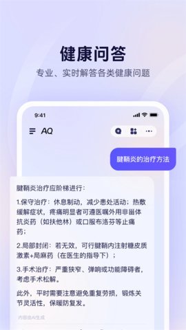 2、提供实时健康问答,用户在使用过程中可以随时提问,AQ会根据最新的医学知识为您提供准确的解答,帮助您消除健康疑虑。