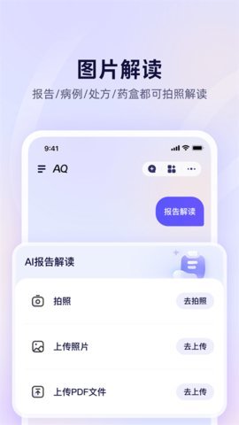 1、图片解读:拍照上传药盒、病历或检查报告,AQ会迅速解读这些信息,并提供详细的健康建议,帮助用户更好地理解病情。