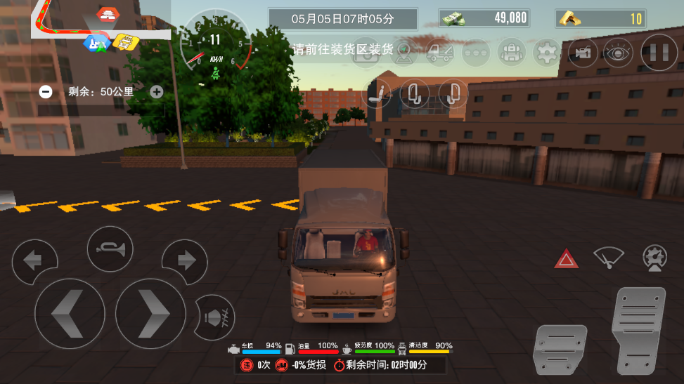 3、进入游戏后,先控制车辆到达前方装货点(左下角为方向控制,右下角是前进和刹车,要倒车时点击前进键挂倒车档)。