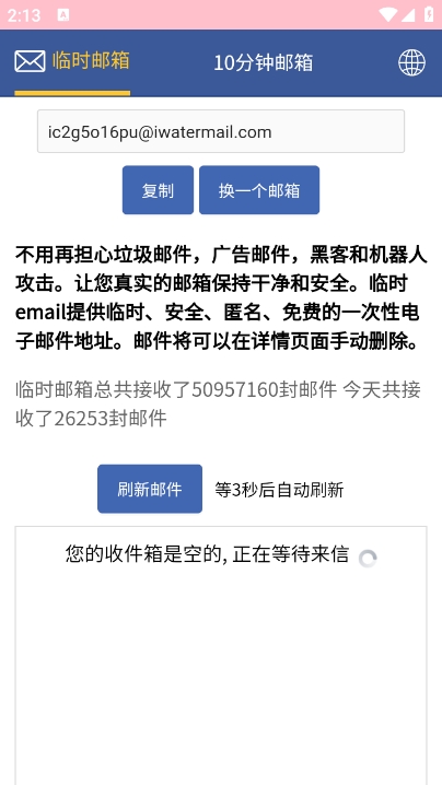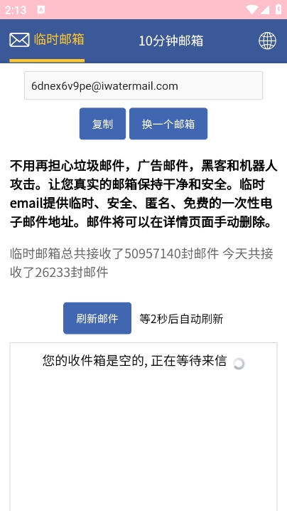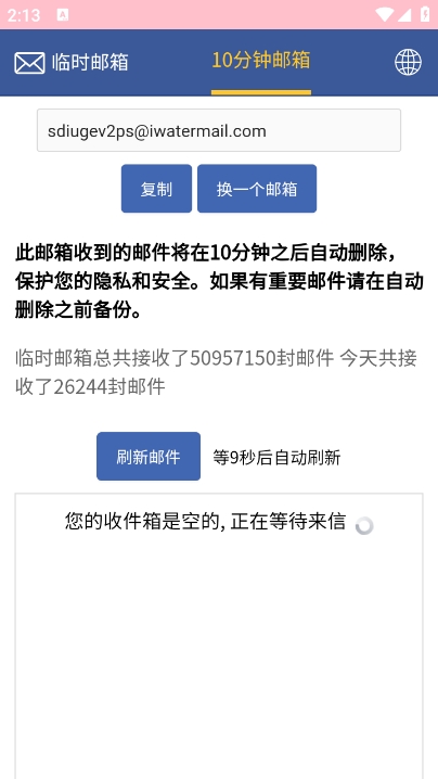 4、手动刷新:十分钟邮箱设有专门的刷新按钮,可以随时手动更新以获取最新邮件。
