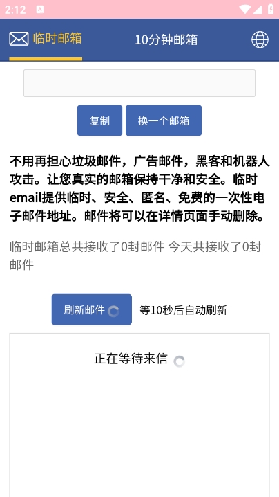 十分钟邮箱app是一款隐私保护的在线工具软件,能够生成随机且有时效性的电子邮件地址,这些地址在设定时间后自动失效,有效隔离垃圾邮件与潜在风险,无需注册或绑定个人真实信息即可直接适合网络注册、验证等短期场景,操作流程简洁,页面响应迅速。