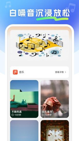 5、丰富的白噪音资源:提供多种类型的白噪音,根据需要选择助眠或专注的音效,帮助放松身心,提升工作和学习效率。