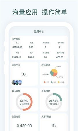 1、让大家生意数据更简单明了,操作简单,不需要专业的财务知识也可以很快上手使用;