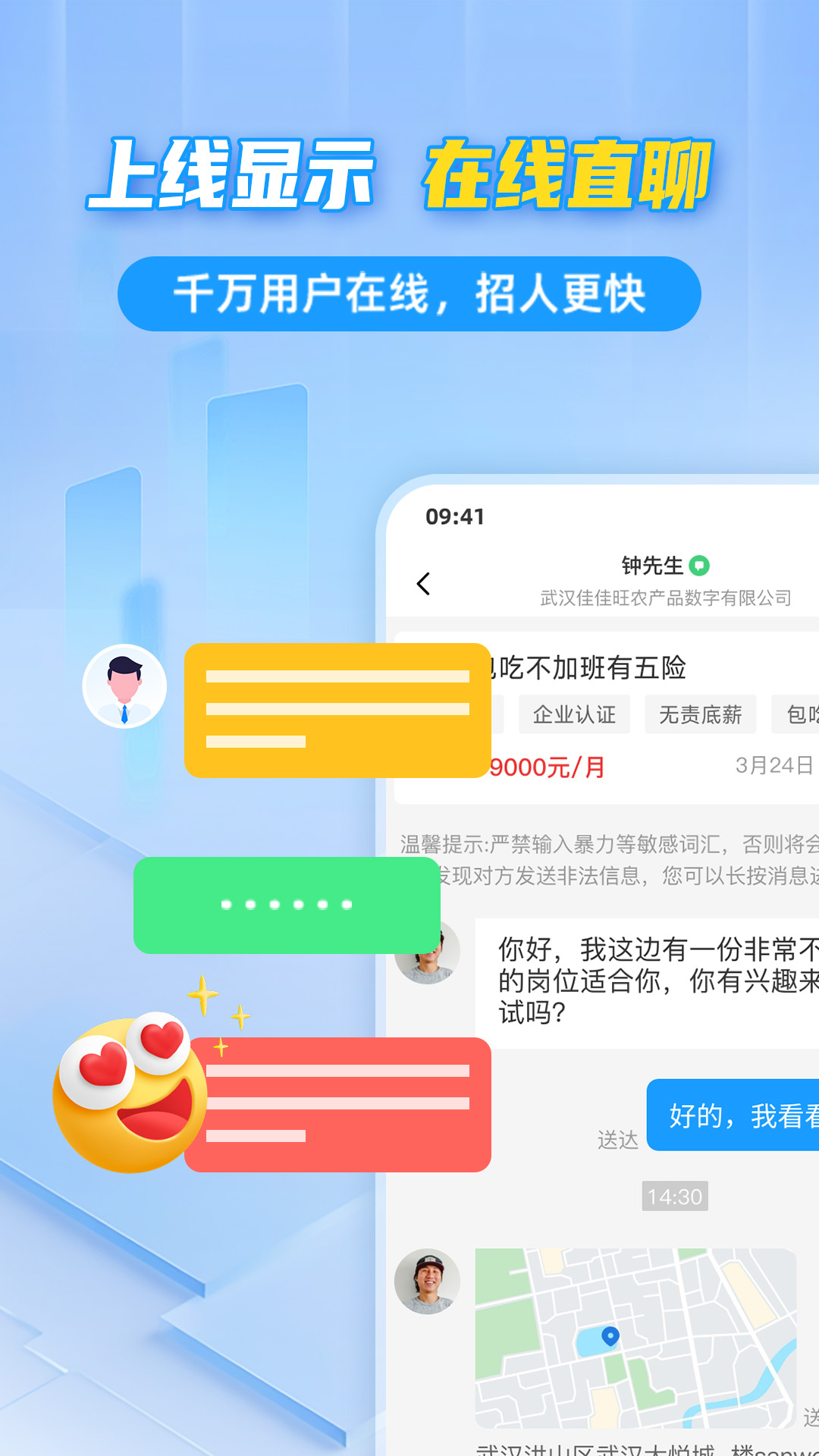5、在求职者与企业之间,您可以使用在线聊天功能,随时进行沟通,询问工作内容、加班情况和福利政策等信息,快速达成招聘意向。