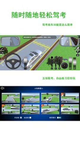 2、科目二考试包括直角转弯、侧方停车、S弯道行驶、倒车入库、半坡起步、停车取卡等10个项目,并支持五项联考和自由练习。