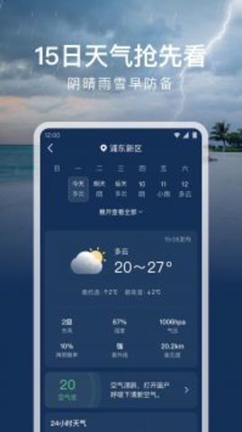 1.24小时预报:每小时显示未来24小时的天气现象、温度、空气质量、风况等信息。