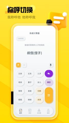 亲戚称呼计算是一款可以帮助用户理清身边亲戚称呼的软件,加入你家亲戚很多,什么三姑六婆的人都来沾边,让你叫人都叫不出来的话,不如用这个计算器,一键解决问题。亲戚称呼计算app支持常见的关系称谓计算,这款软件使用非常简单,无需登录,打开软件就能计算亲戚关系。