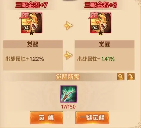 觉醒:第三个就是魂灵觉醒了,每次觉醒可以提升魂灵出战的百分比属性,这个属性是指所有的属性,比如攻击、生命、防御之类的,全部都会得到提升,但是每次觉醒所需要的觉醒材料也会随着觉醒的等级所提升,觉醒等级越高所需要的材料也会越高,材料也是可以在升灵台内进行获取。