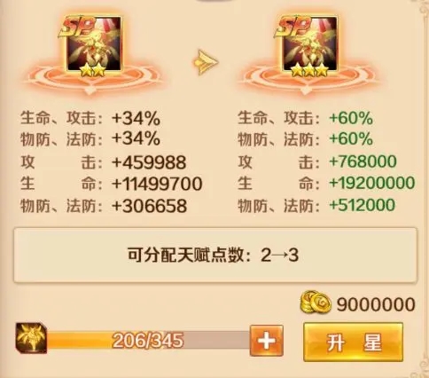 武魂真身升星:关羽武魂真身的升星对于战力的提升是最大的,但是每次升星所需要消耗的高级武魂真身精华也是非常大的,因为每次是增加武魂的百分比属性又可以增加基础属性,而且每升一星也能获得一个天赋分配点数,天赋分配点数可以在天赋内进行解锁天赋。