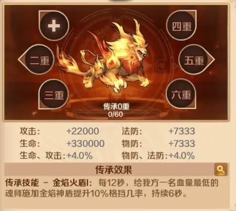 传承:魂灵传承的提升是需要消耗S级魂灵的碎片的,而且一共是有6重的的传承,每次升级传承效果可以提升魂灵的传承技能,提升得越多,魂灵的传承技能还会增加额外的效果。