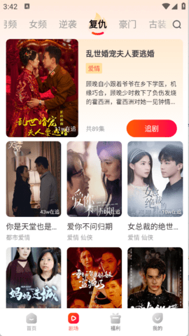 2、进入首页后,用户会看到丰富的短剧资源,涵盖了多种类型,如逆袭、复仇、古装等,根据自己的兴趣选择观看。