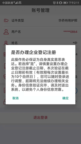 2.通过后,在APP的“账号管理”界面对“是否办理工商登记注册”和“有效期”选项进行设置,设置为“是”并在“有效期”范围内的,可以继续办理登记业务。