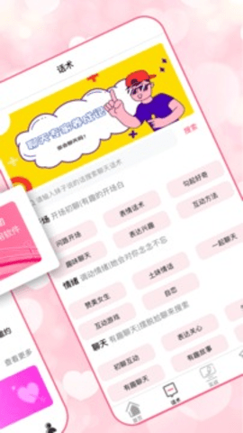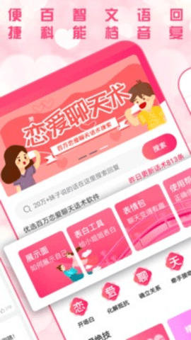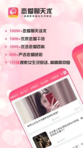恋爱聊天术是一款可以帮助你提高聊天技巧的软件;这款软件可以帮助单身的你解决现实生活中与女生交流聊天遇到的各种问题,聊天没有话题,不知道怎么逗女生开心,不知道怎么表白等问题,不知道送什么礼物;遇到这些问题的你先不要慌,赶紧使用恋爱聊天术app,里面能提供给你许多的有效脱单方法,丰富的聊天干货,精彩的教学视频,让你快速提高聊天技巧教你表白套路