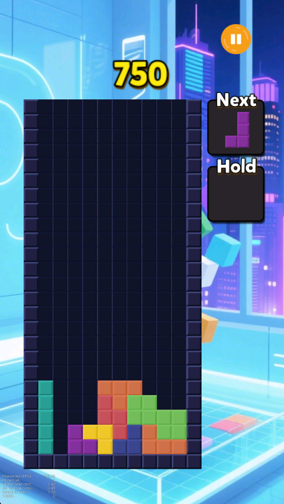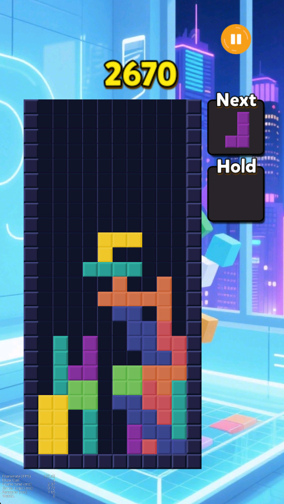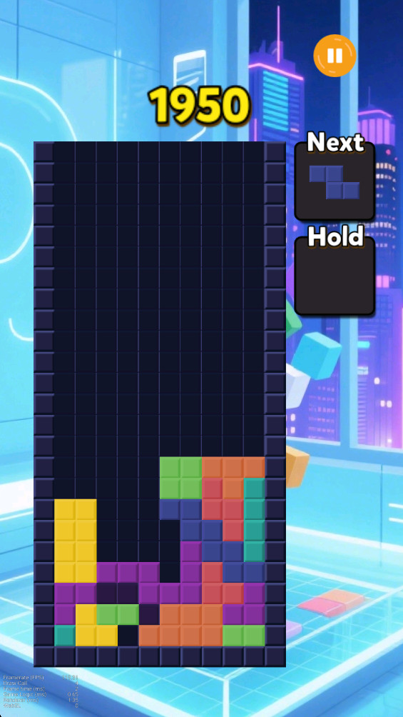 3、当你成功拼凑出一整行方块时,们会消失并为你带来积分,记得时刻关注屏幕上方的分数变化,挑战自我极限!