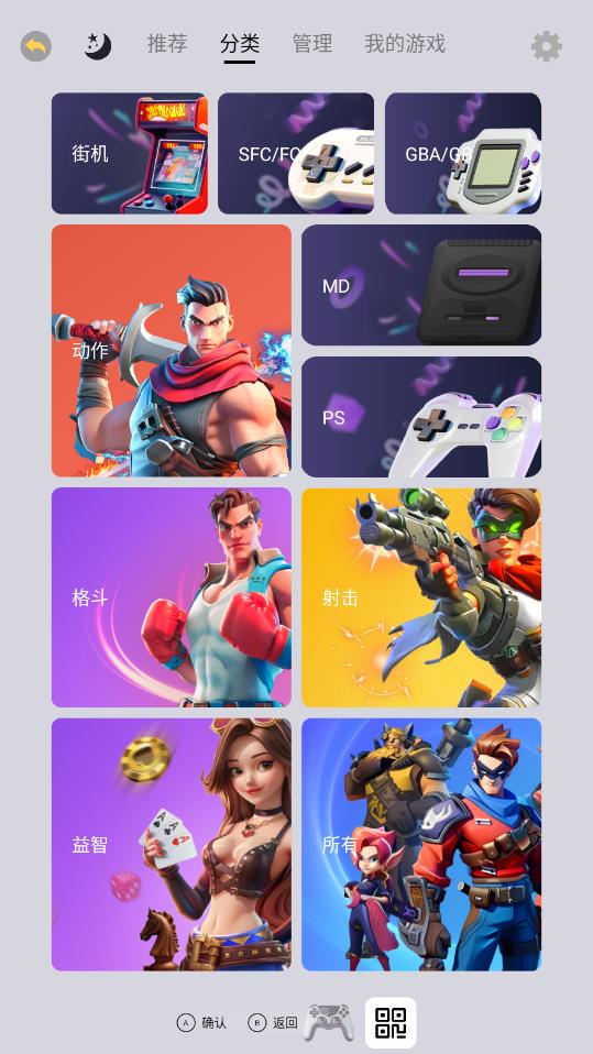 2、资源库按照游戏机型和游戏类型进行双重归类,街机、FC、GBA等模拟器资源划分清晰,方便用户快速定位目标。