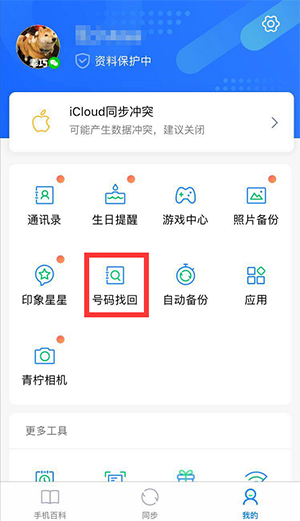 请右下角【我的】菜单中,点击【号码找回】,即可找到“回收站”和“时光机”。