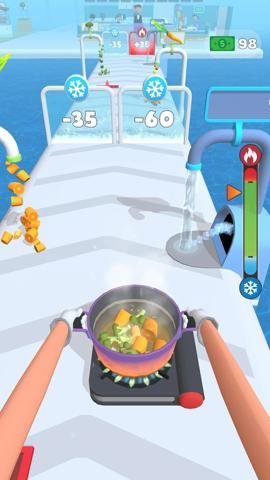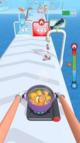 1、在玩家需要一边收集食材,一边手捧火锅盆进行跑酷,避开各种障碍物,为顾客提供各种美味的火锅。