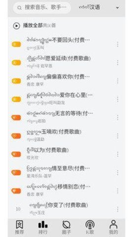 1、下载并安装傣族基地应用,打开软件后会看到主界面,展示了推荐的傣族歌曲列表。