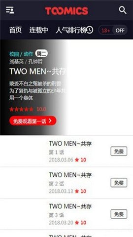 1、下载并安装Toomics玩漫应用,打开后会看到简洁的首页界面,展示热门漫画推荐。