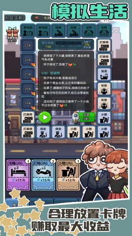 完成一天的安排后,点击绿色播放按钮,时间将开始流逝,玩家的生活将按照卡牌的效果逐步展开。每张卡牌的效果都可能影响角色的状态,甚至直接影响到收入。通过执行卡牌效果,玩家可以完成既定目标,获取额外的钞票奖励,奖励机制让游戏的目标感更加明确。