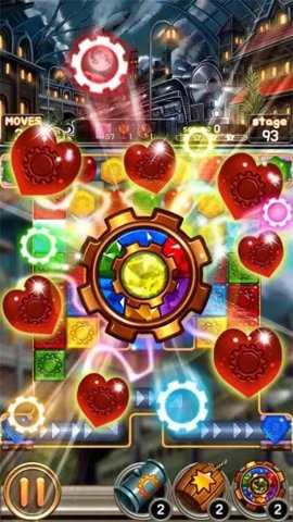 宝石蒸汽世界的玩法围绕着经典的三消机制展开。玩家通过交换相邻的宝石,形成三颗或更多相同颜色的宝石连成一线进行消除。每次消除都会为玩家带来积分,同时也会使得下方的宝石重新排列,为下一次的消除创造机会。玩家需要仔细观察关卡的布局,制定合适的消除策略,力求在最少的步数内完成目标。