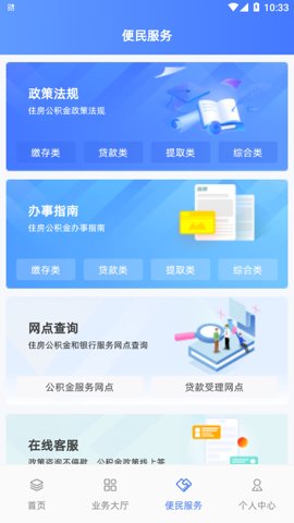3、便民服务模块提供政策法规和办事指南,随时查阅,了解最新的公积金政策和办理流程。