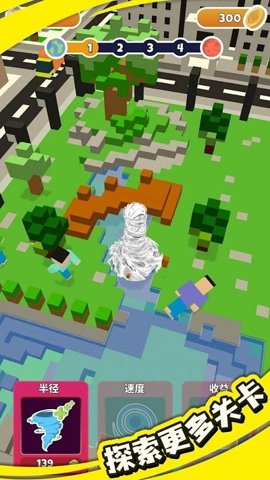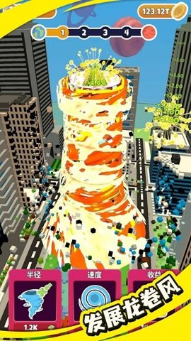 2、通过不断地卷起物品,玩家不仅能获得能量,还能解锁更强大的龙卷风,提升自己的破坏能力,带来更高的得分。