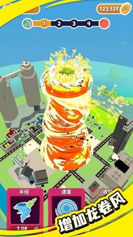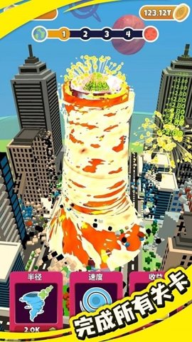 在游戏的开始阶段,玩家将面对一片城市的景象,轻轻点击屏幕即可释放出一阵龙卷风。每一次点击都会消耗一定的能量,因此合理利用能量至关重要。玩家可以选择先从小型建筑开始摧毁,逐渐积累能量,提升龙卷风的等级,解锁更强大的风暴。