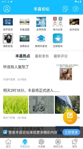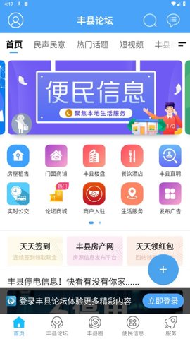 丰县论坛APP是一款专为丰县人民量身定制的综合性生活服务平台。提供最新的本地资讯,还为用户创造了一个丰富多彩的社交环境。无论是寻找工作、拼车出行,还是想要了解本地美食和娱乐活动,丰县论坛都能满足你的需求。在这里,你可以轻松获取丰县的各类信息,结识志同道合的朋友,分享生活中的点滴,体验到真正的社区氛围。下载丰县论坛,开启你的便捷生活吧!