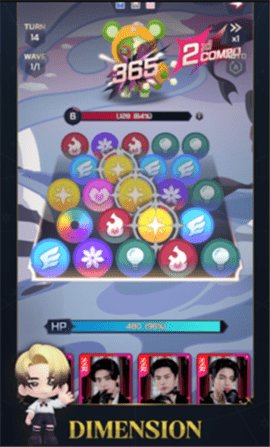 1、游戏中的三消战斗不仅仅是消除元素,更是守护偶像记忆的重要方式,玩家需灵活运用策略来击败DIMENSION世界的怪物。