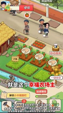 在《幸福农场主红包版》中,玩家将迎来一段充满乐趣的农场经营之旅。游戏刚开始,你将拥有一块田地,随着不断的种植和升级,你将解锁更多心仪的作物。每当你根据订单完成种植,都会获得丰厚的红包奖励。无论是升级田地、收割蔬菜,还是经营菜市场,红包奖励源源不断,福利多多,简直让人欲罢不能。游戏不仅是一款模拟种菜的红包游戏,更是一个让你体验农场生活的精彩舞台,快来与我一起开启这场种植之旅吧!