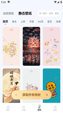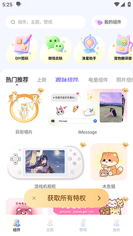1、打开软件主界面,底部导航栏有组件、主题等入口,点击组件进入浏览页面。