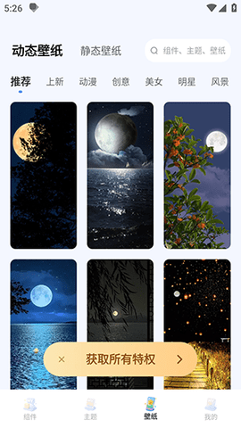 2、壁纸库区分了动态与静态两种类型,部分动态壁纸带有简单的交互反馈效果。