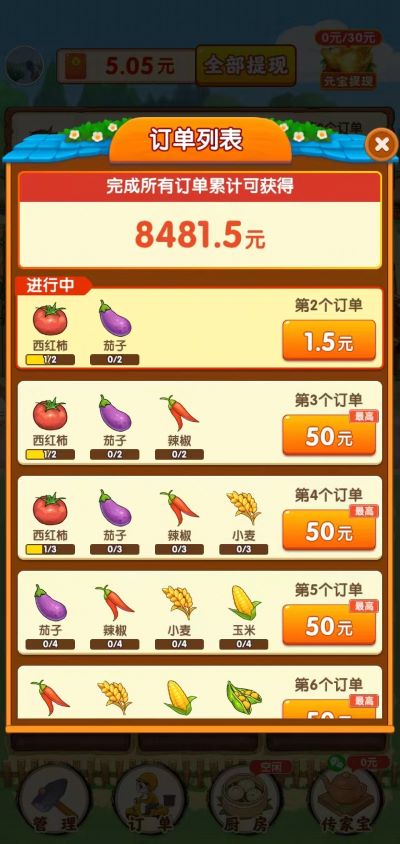 2、完成系统发布的食材订单,能够解锁新的菜谱并制作菜肴,从而吸引虚拟顾客光临。