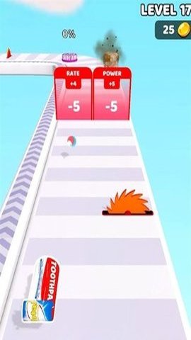 2、游戏中设有丰富的道具系统,玩家可以通过收集金币来解锁新的牙膏皮肤,购买加速器和抗性道具,从而提升角色在赛道上的表现,增强游戏的趣味性。