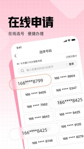 2、提供在线选号的功能,直接在APP中选择自己喜欢的小号,快速完成申请过程。