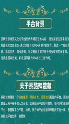 泰酷辣数藏是一款致力于数字藏品收藏的应用,旨在为用户提供一个丰富多彩的数字资产交易和社交互动平台。无论是想要了解数字收藏市场的投资者,还是热衷于数字文化的爱好者,都能在这里找到属于自己的天地。该应用让用户不仅能提升数字藏品的价值,还能通过社交互动,获取更多的投资收益,真正实现数字收藏的乐趣与价值。
