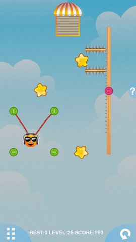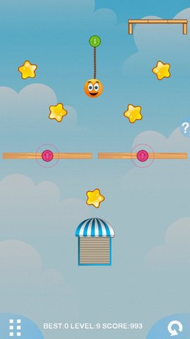 1、玩家通过触摸屏幕来控制红色圆钮的拖动,从而改变绳子的状态,影响橙子的移动。